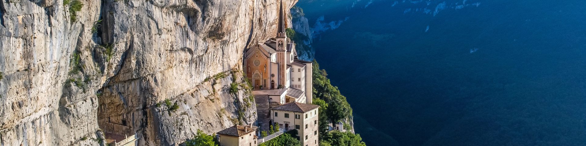 - Skalni predor in most: Proti vrhu pot postane zares dramatična. Hodili boste pod previsnimi stenami in čez mostičke, dokler se pred vami nenadoma ne prikaže cerkev, ki “lebdi” v steni gore Monte Baldo.