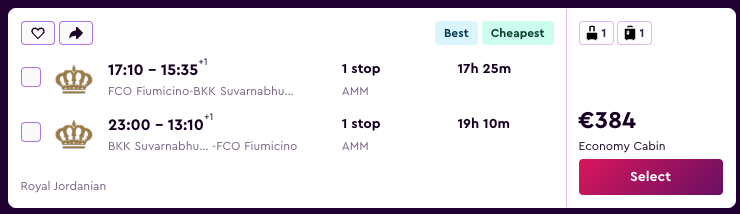 - Relacija: Rim Fiumicino (FCO) – Bangkok (BKK) – Rim Fiumicino (FCO).